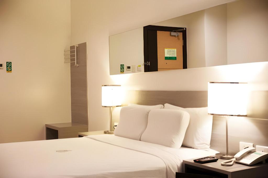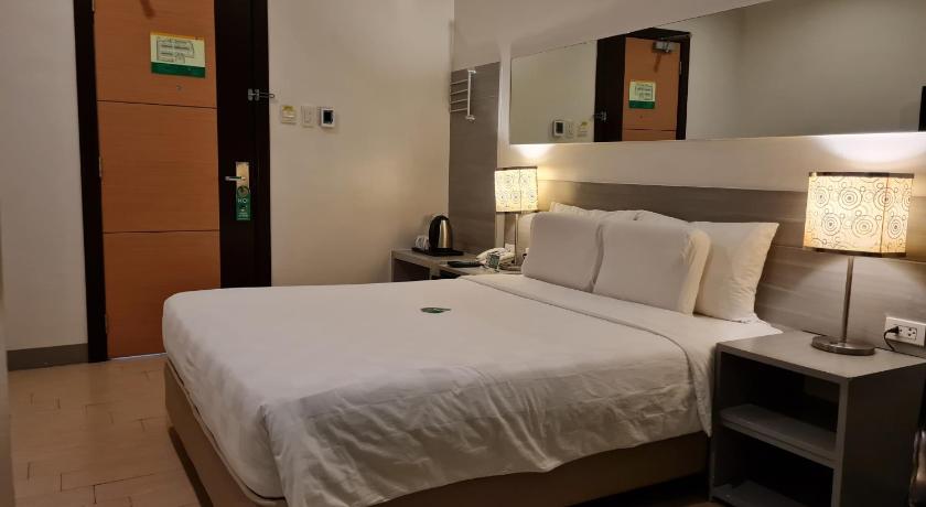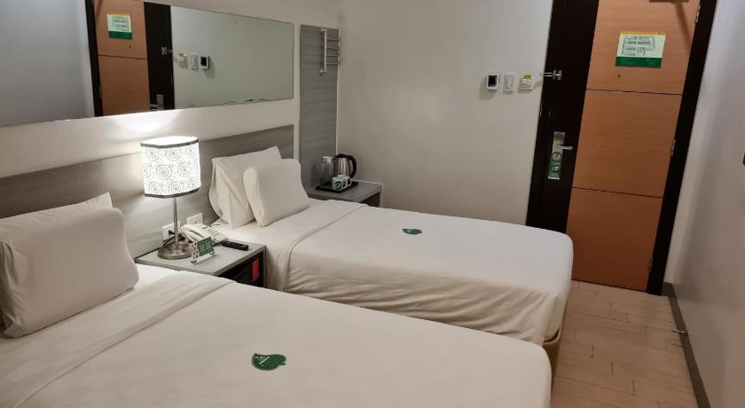 The gallery highlights crisp, air-conditioned rooms with neutral décor and bright lighting. Comfortable beds with clean linens stand out, while bathrooms showcase functional design with walk-in showers. Exterior images capture the property’s direct connection to Robinsons Otis Mall, emphasizing convenience for shopping and dining.